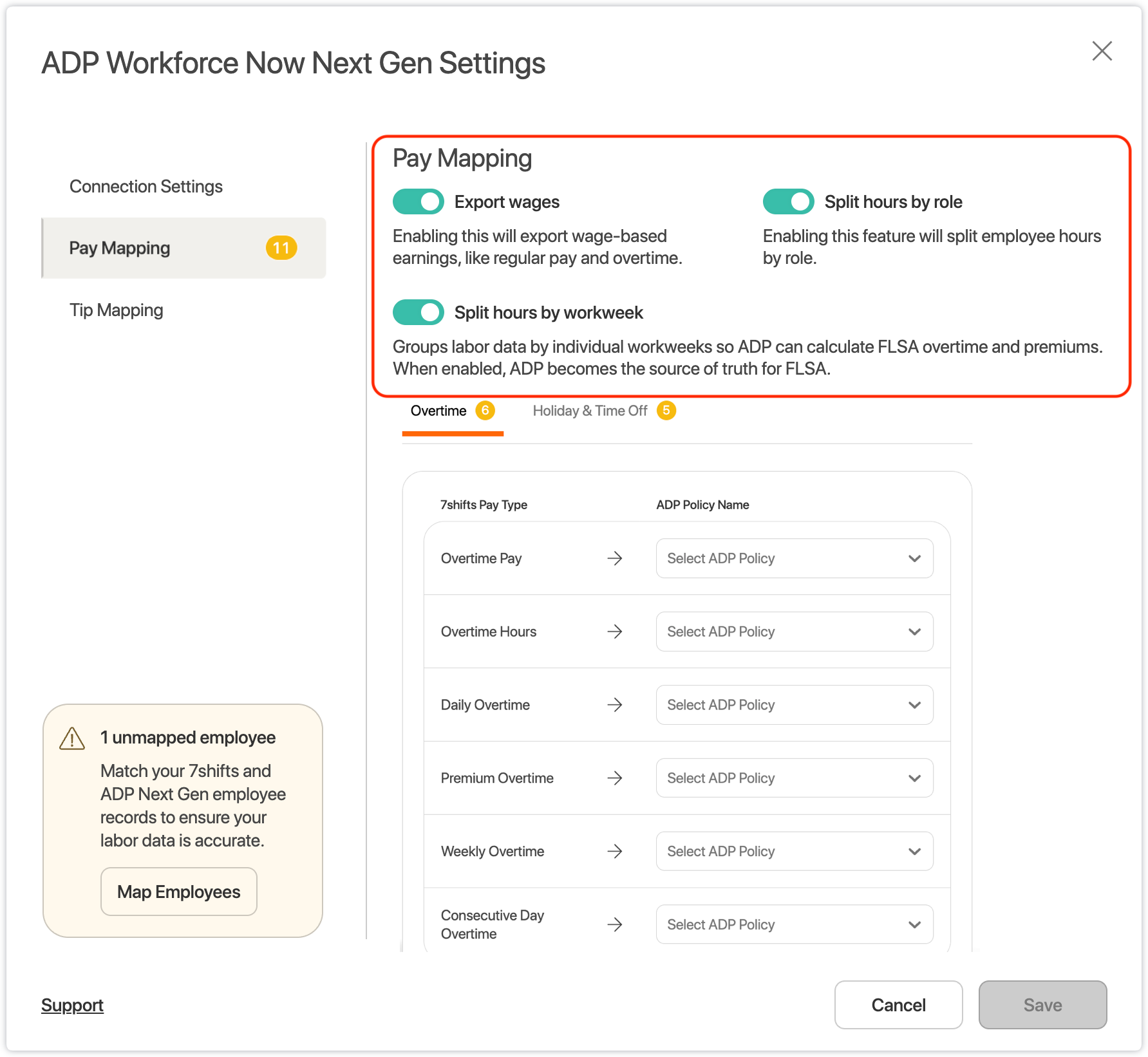 The Pay Types available for mapping are determined by your specific Labor & Overtime settings in 7shifts. Ensure your labor rules and overtime thresholds are correctly configured in 7shifts Labor & Compliance settings to see the corresponding mapping options.