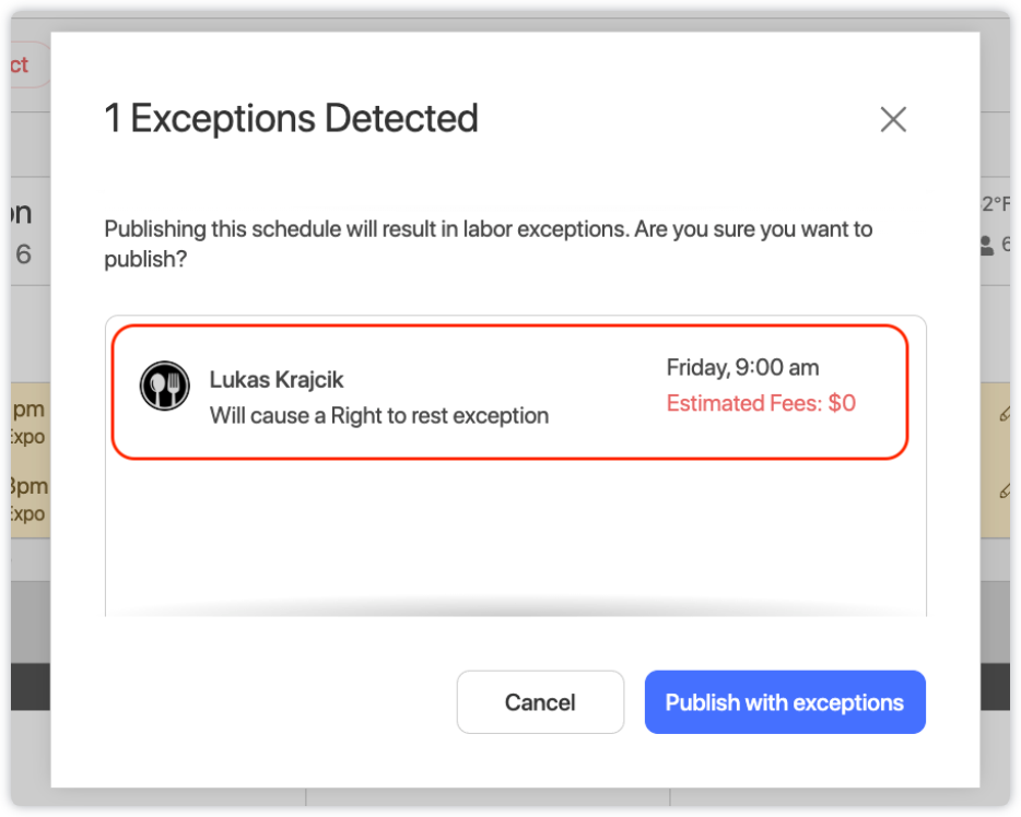 Before publishing a schedule, if there are labor exceptions that will be incurred, you will see a summary showing the number of exceptions, the total cost, and details of each exception. Once published, the exceptions will be recorded in the report.