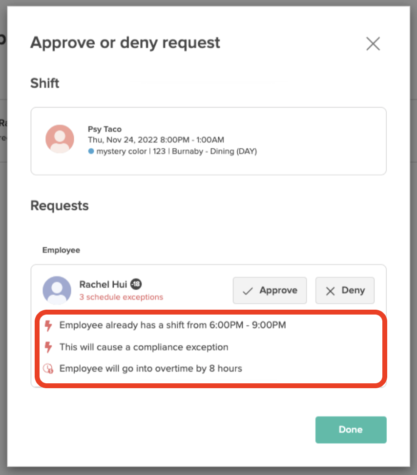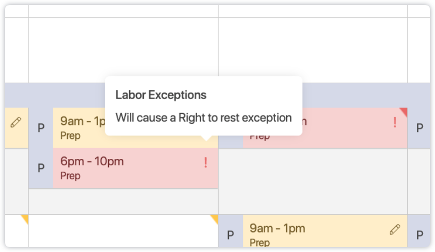 To avoid/reduce exceptions, you will be warned about potential exceptions as you make changes to your schedule. Each time you create or make a change to a shift that causes an exception, a warning modal will appear indicating the type of exception and the associated cost.