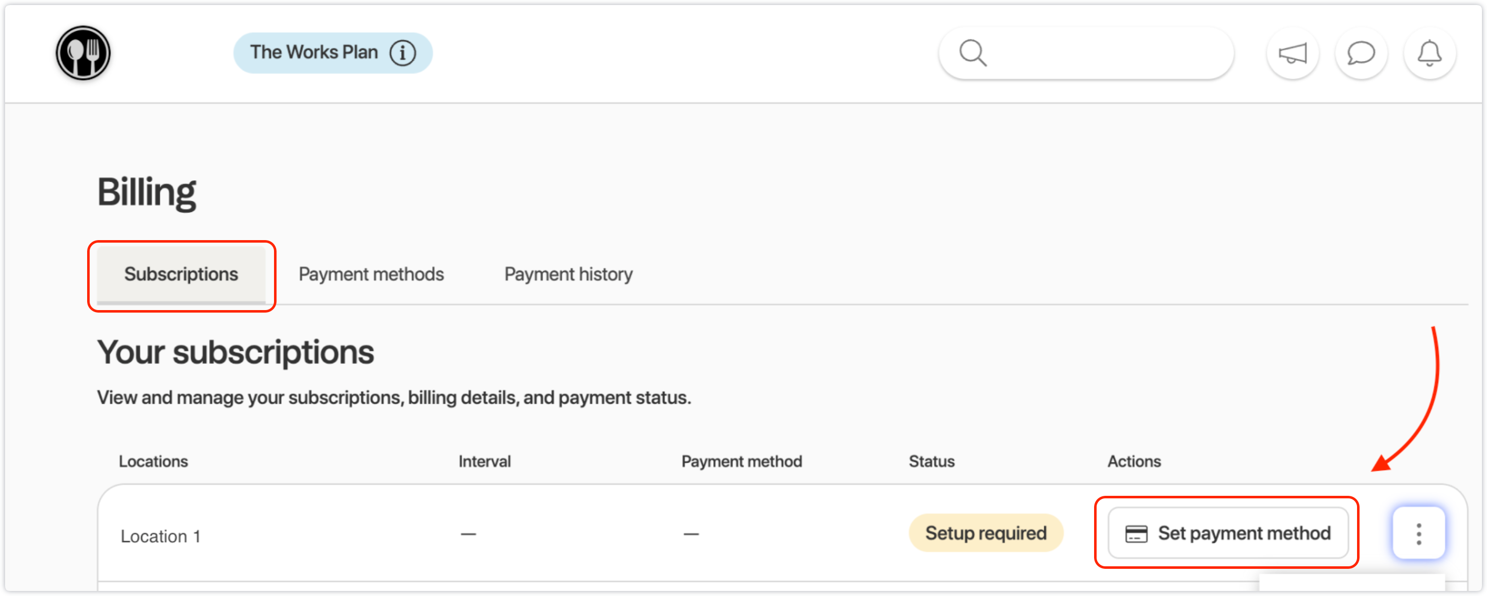 - You will see a Setup required status next to the new Location if the payment method still needs to be assigned.