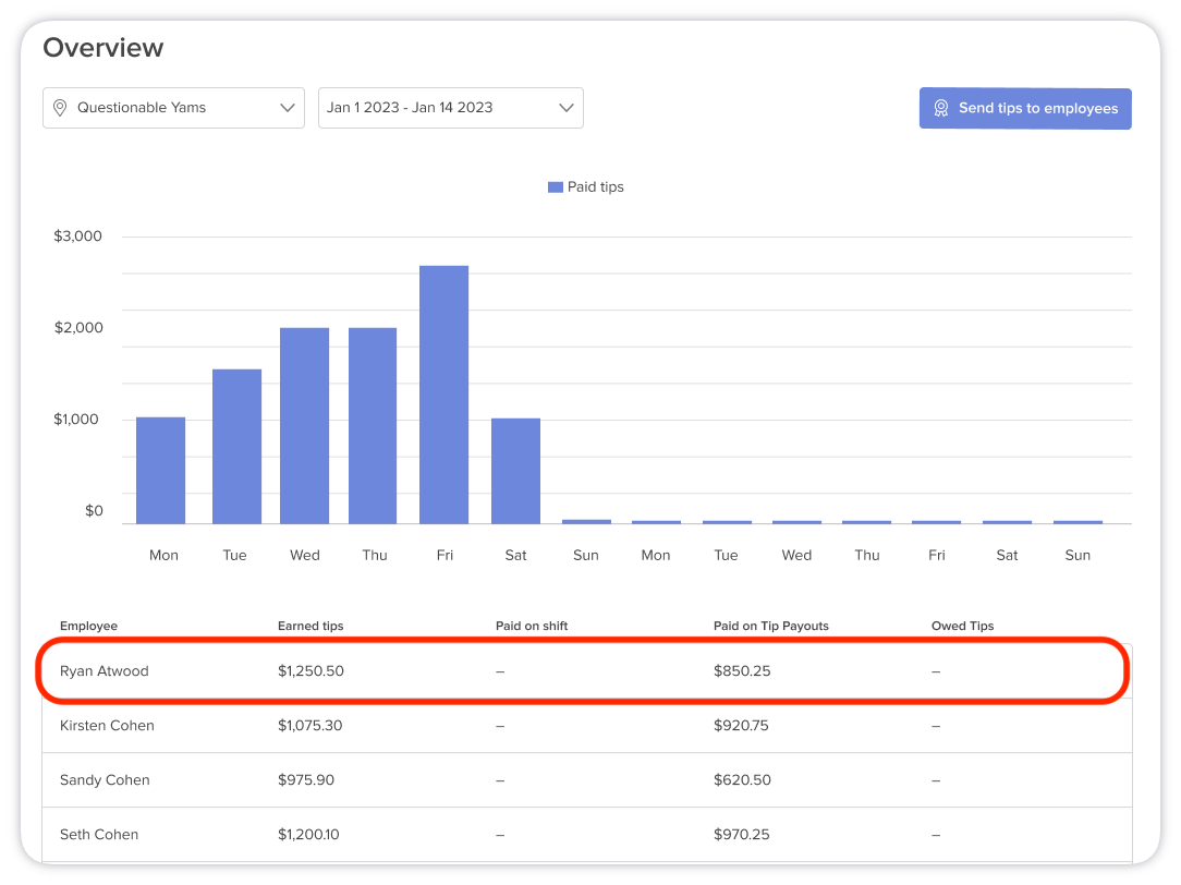 ⚠️ Sending tips to Employees from the Tip Overview is only available for Accounts with Tip Payouts enabled. Click here to learn more.
