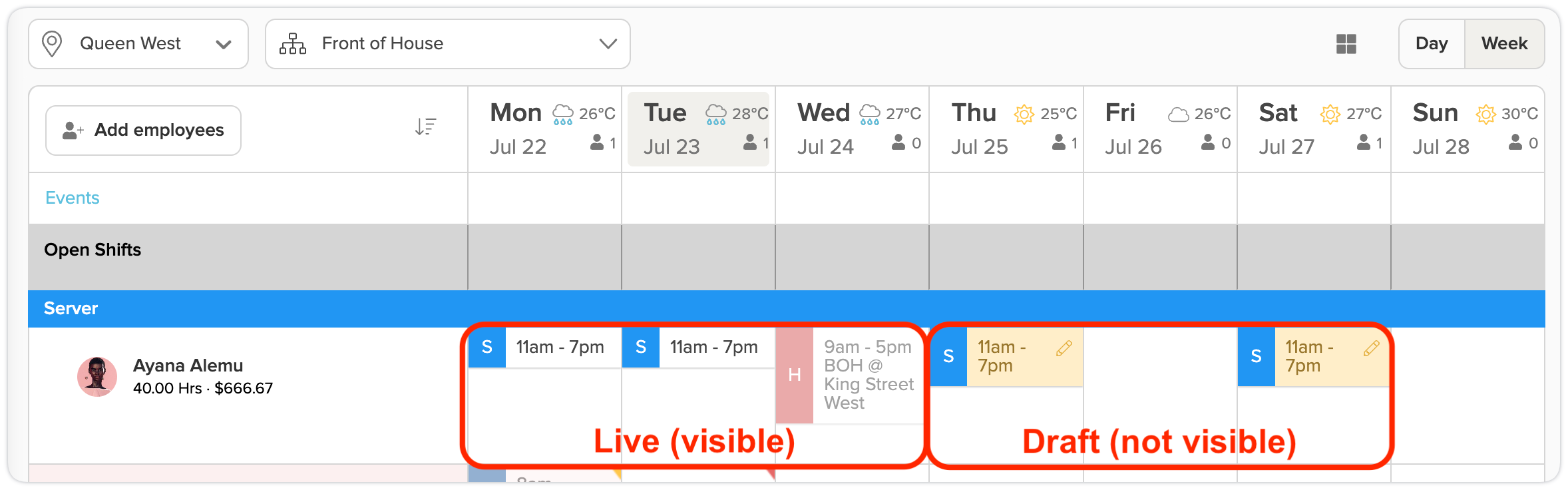 As you add shifts, you'll find it helpful to differentiate between shifts that are published/live or in draft. In the example below, Ayana's schedule displays both live shifts (visible to Ayana) and draft shifts (not visible to Ayana):