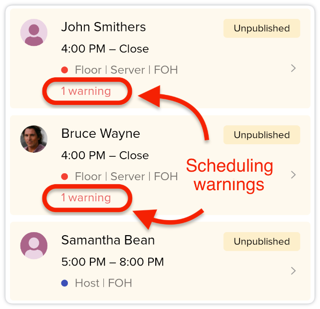 Scheduling warnings will be labelled in red for things like overtime and labor exceptions: