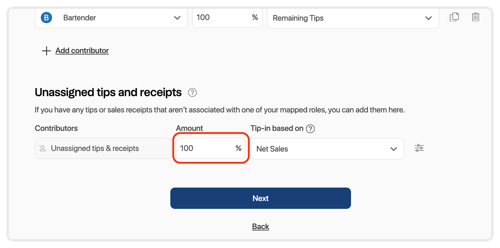 Contribute by RoleThe team members under the Role can be both 'Contributors' and 'Recipients' (in step 9). This step is to determine how much of the initial tips received will contribute to the Tip Pool to be divided out later across the team.