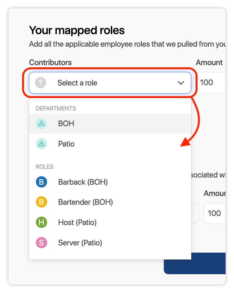 • For Your mapped roles (transactions that are assigned to Employees), you will need to select which Roles and Departments will be your Contributors. Contributors are usually customer-facing employees that gather tips, and gratuities or collect payment during their shifts. Use the dropdown menus below to set your measures and filters.