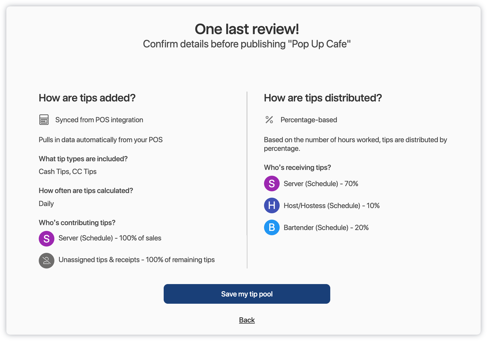 13. Review the tip pool overview and click Save my tip pool: