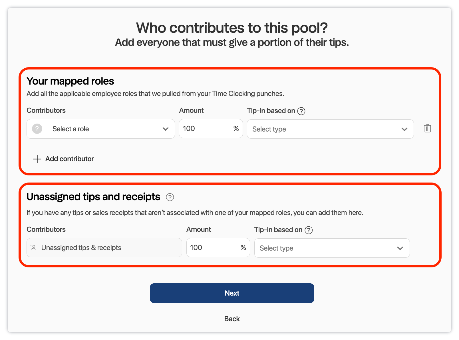 To accomplish this, create a new tip pool. While adding your Contributors, be sure to select Tip-in Based On: Remaining Tips.
