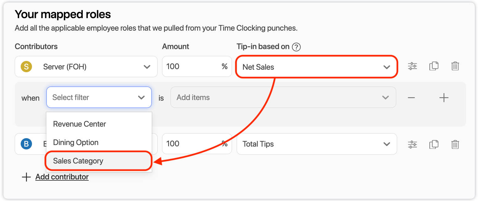 Note: Filtering by Sales Category is only available when Tip-in based on Net Sales is selected.