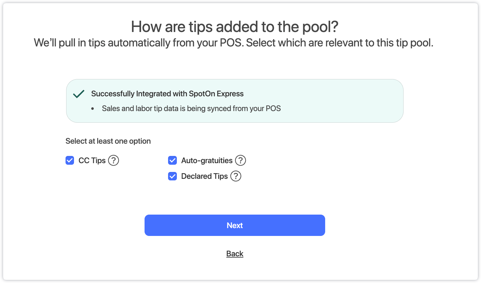 4. Select the option Pull in tips automatically from my POS and click Next.