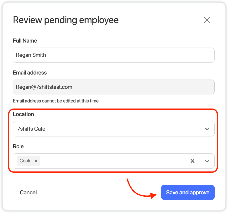 Click Save and approve to accept the request and invite employee to 7shifts.