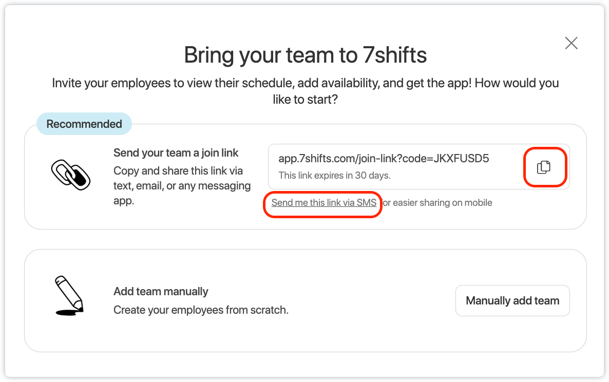 Tip: You don't need to save the link! You can view and grab the join link as many times as you need from the Add Employees section on the Schedule page. A new link is generated daily and previously shared links remain active for 30 days.