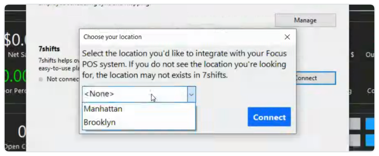 - Map your Focus POS location to the corresponding 7shifts location using the dropdown menu > Connect:
