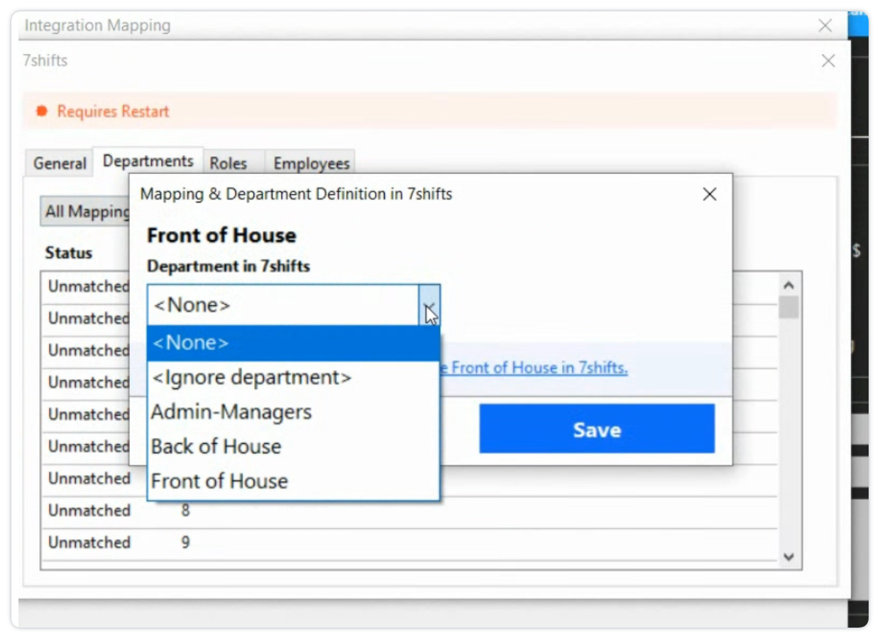 - Click the Departments tab to map departments. You will have the option to create new Departments in 7shifts directly from this screen if they don't already exist:
