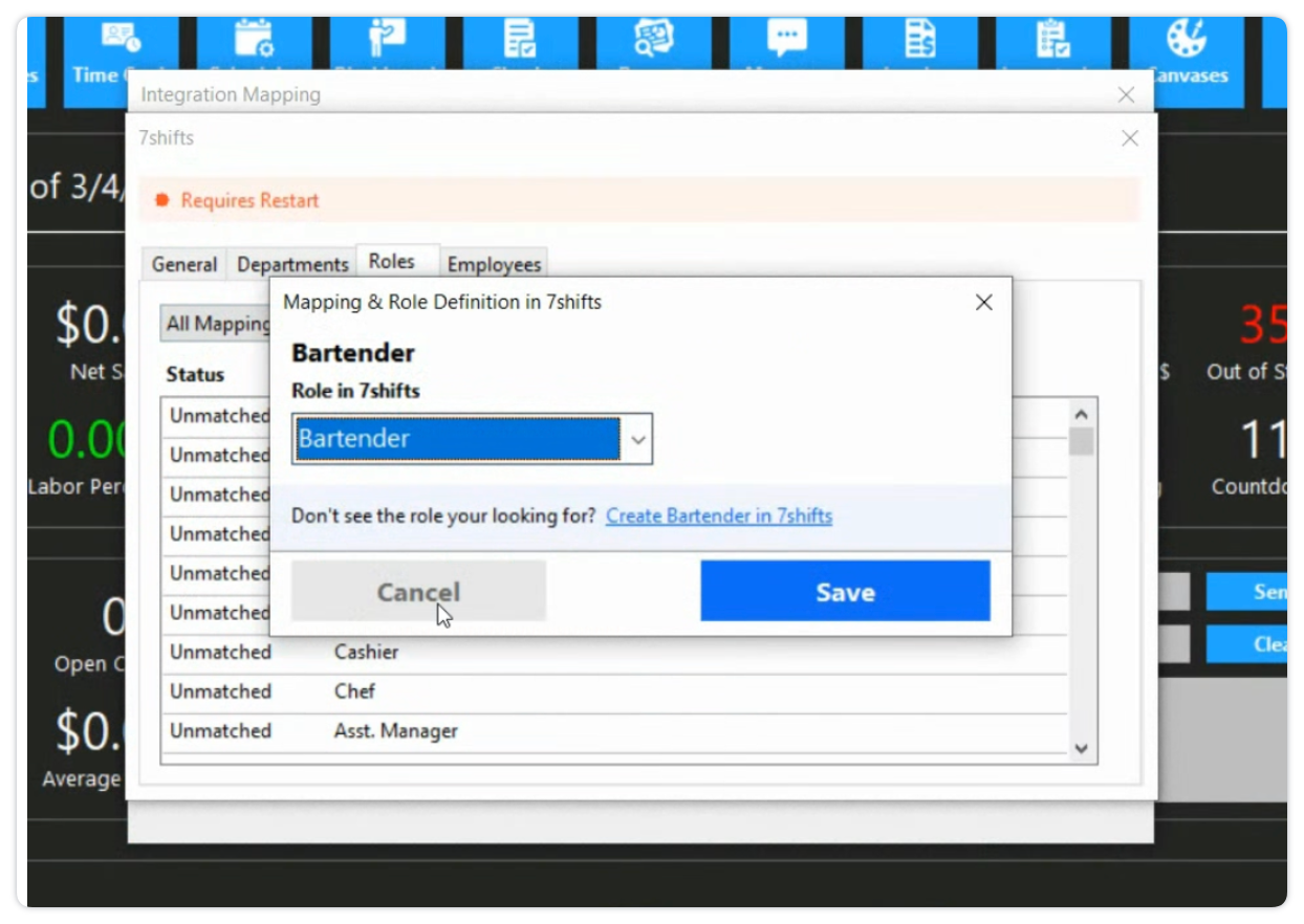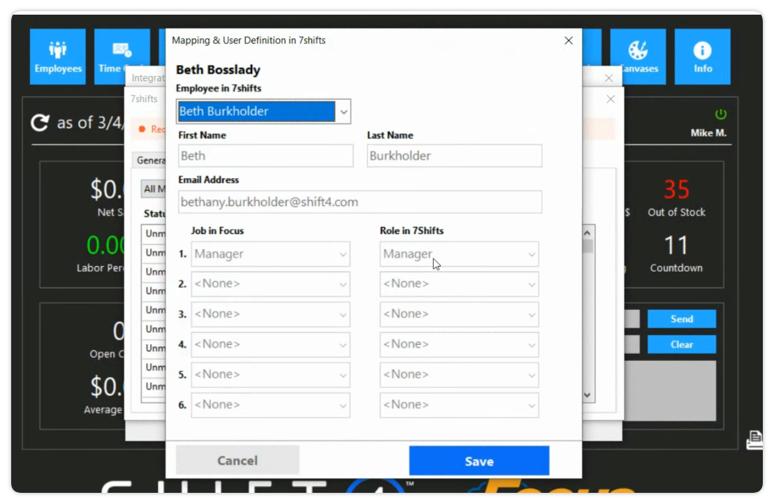 - Click the Employees tab to match your Focus POS staff to their 7shifts profiles. All Roles assigned to a user in the POS be mapped to a corresponding 7shifts Role to prevent sync errors: