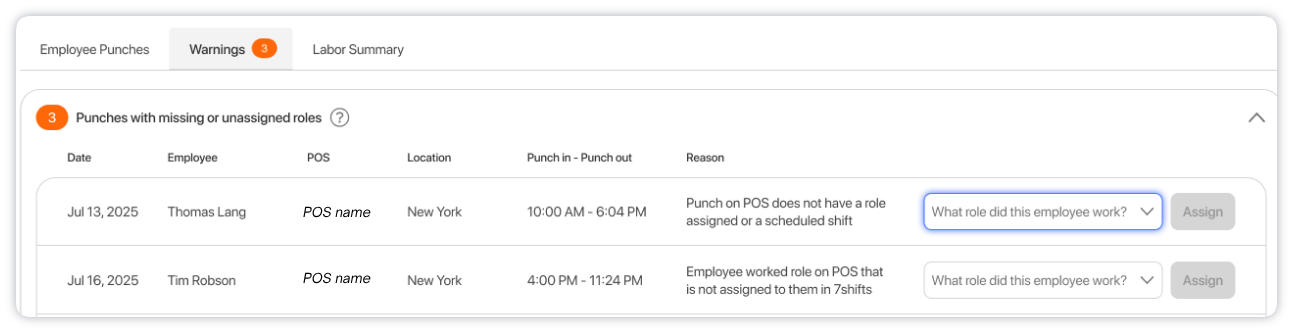 Once your POS labor is syncing into 7shifts, you will see a Warnings tab when reviewing your current pay period. This tab highlights punches missing a role in your POS/7shifts labor data that may need attention before running payroll.