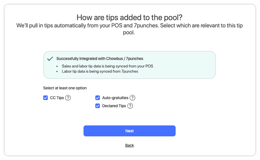 - Select the checkboxed fields from the POS that 7shifts should pull tip data from and click Next. These fields may vary depending on the specific setup on your POS.